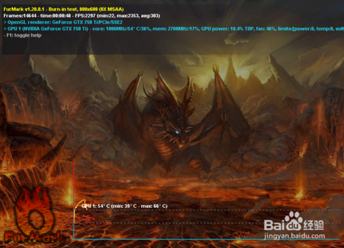 軟件左上角是顯示的信息,包括幀率在這個(gè)800x600分辨率下如何,溫度cpu能耗的信息。通過這里可以看得出這個(gè)gpu的性能如何。如果要隱藏上面的信息,按字母【i】即可,恢復(fù)顯示重新按【i】。