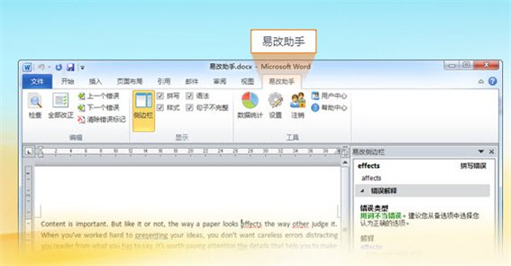 易改助手Word插件能自動發(fā)現(xiàn)并糾正英語文本中的錯誤,例如拼寫,語法,樣式統(tǒng)統(tǒng)都行。同時為了避免下次再犯同樣錯誤,軟件會根據(jù)該錯誤或潤色建議給出詳盡解釋,大大優(yōu)于word自帶糾錯效果。該軟件使用人群廣泛,無論你是職場白領、商務人士、準備出國留學人員和學生,易改助手都將是你必備的英語寫作利器,快速提升您的英語水平。