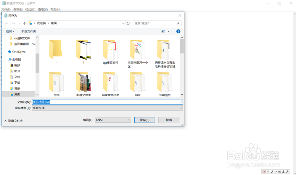 3、記事本另存為“系統(tǒng)清理.bat”(文件名可自定,文件擴(kuò)展名必須是.bat),另存為時(shí)“保存類型”選擇“所有文件”