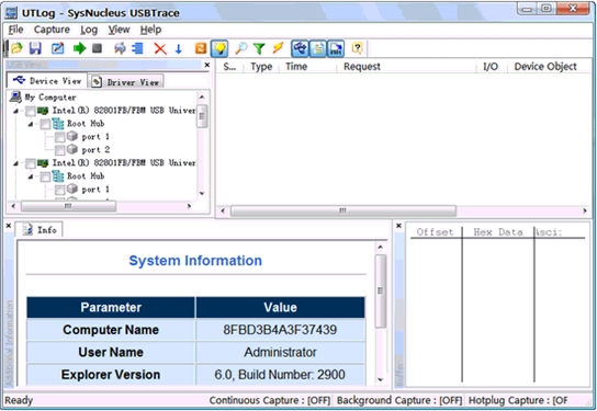 它可以監(jiān)控包括 USB 控制器,USB 集線器和 USB 設備的連接,請求,和運行情況。也可以為 WDM 驅(qū)動程序開發(fā)者提供豐富的信息??梢栽O定程序在后臺進行信息捕獲,或者持續(xù)的捕獲以便進行分析。