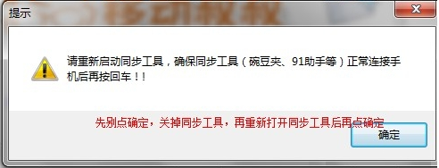 3、稍等片刻,這時(shí)候會(huì)出現(xiàn)“請(qǐng)重新啟動(dòng)同步工具,確保同步工具正常連接手機(jī)”字樣的對(duì)話畫。這時(shí)先別點(diǎn)界面的確定按鈕。
