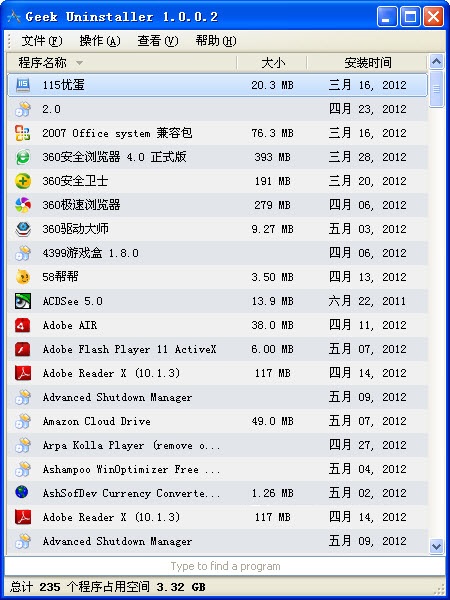 ②界面簡單,使用方便。這個軟件只有一個主界面。windows中所有已安裝的軟件會全部顯示在這里,而所有和卸載有關(guān)的功能都集中在右鍵菜單中。