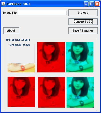 該軟體使用 Java 撰寫(xiě),所以在 Windows、Mac 或 Linux 作業(yè)系統(tǒng)均可以執(zhí)行,且使用方式簡(jiǎn)單,只需將原始圖檔載入,便可轉(zhuǎn)換出 R、B+G Filtered、Trans 與 3D 影像圖,轉(zhuǎn)換后,需使用 3D 立體眼鏡來(lái)觀看