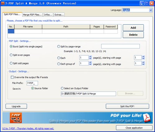 7-PDF Split And Merge便攜版是免費(fèi)PDF格式編輯器工具軟件非常方便,快捷正確的分割和合并PDF的文件。您可以撰寫新的PDF-文件,而使用個(gè)人sortings或(類似Word中打?。┒ㄖ频哪J?。您可以附加加密的PDF文件到另一個(gè)PDF文件。它不需要密碼就可復(fù)制密碼保護(hù)的PDF文件。