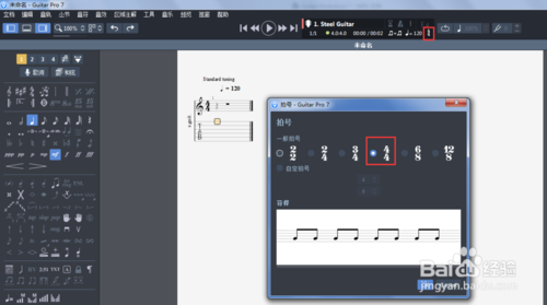 4.三連音設(shè)置完成之后是節(jié)拍,我們點(diǎn)擊工具欄的節(jié)拍圖標(biāo),在彈出拍號(hào)窗口選擇4/4拍。