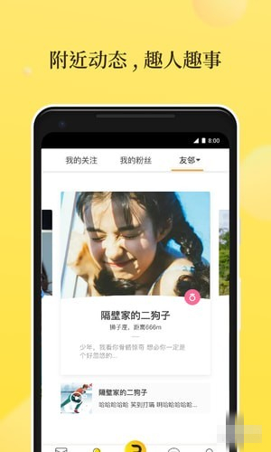 通過滑動友鄰卡片或者直接在首頁列表上發(fā)現(xiàn)周邊的用戶與趣聞。