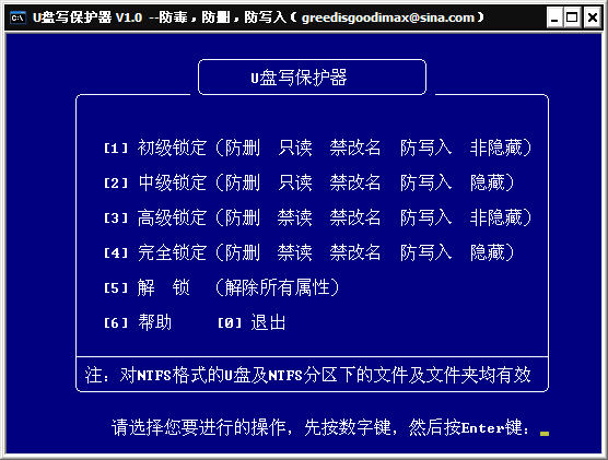 U盤寫保護 v1.0 綠色免費版 u盤寫保護軟件是一款通過修改了文件的訪問權限來實現(xiàn)保護U盤的目的的軟件,它不會改寫注冊表,不創(chuàng)建隱藏文件夾,不改變文件結構,完全不會損壞原有數(shù)據(jù)經(jīng)由本軟件鎖定的U盤或文件夾,在其它機器上均可保持鎖定狀態(tài),也可由本軟件隨時解除鎖定狀態(tài)可自由將U盤設置為 防刪 禁讀 禁改名 防寫入 隱藏等屬性