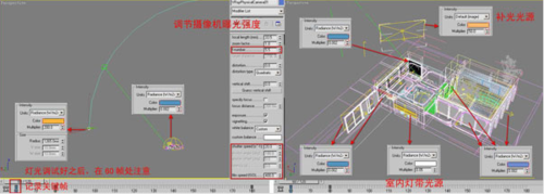 接著在場(chǎng)景中的窗口門(mén)口以及光源體處創(chuàng)建VR燈光,燈光分布如圖所示。注意每個(gè)燈光的參數(shù)調(diào)節(jié)到位之后在當(dāng)前第60幀的位置記錄一次關(guān)鍵幀。