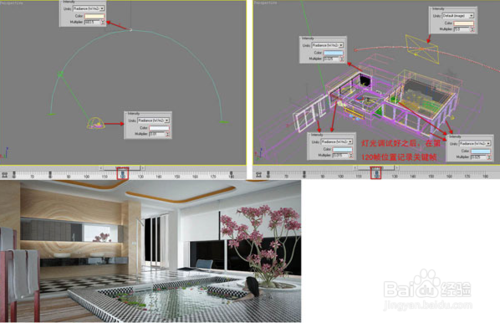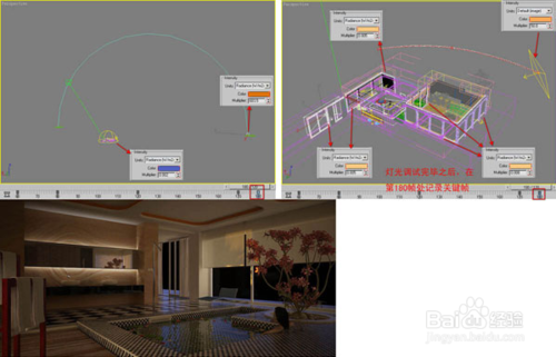 幾個(gè)關(guān)鍵時(shí)刻的效果調(diào)試完畢并記錄關(guān)鍵幀之后,那么每?jī)蓚€(gè)關(guān)鍵幀之間,燈光的顏色、強(qiáng)度和位置會(huì)產(chǎn)生逐漸的過(guò)渡變化,通過(guò)渲染,最終可以形成每一時(shí)刻的光照效果。這期間每個(gè)時(shí)段的效果均可以按照以上方式來(lái)一一進(jìn)行動(dòng)畫(huà)定義,以獲得更精確的時(shí)間顏色和強(qiáng)度。