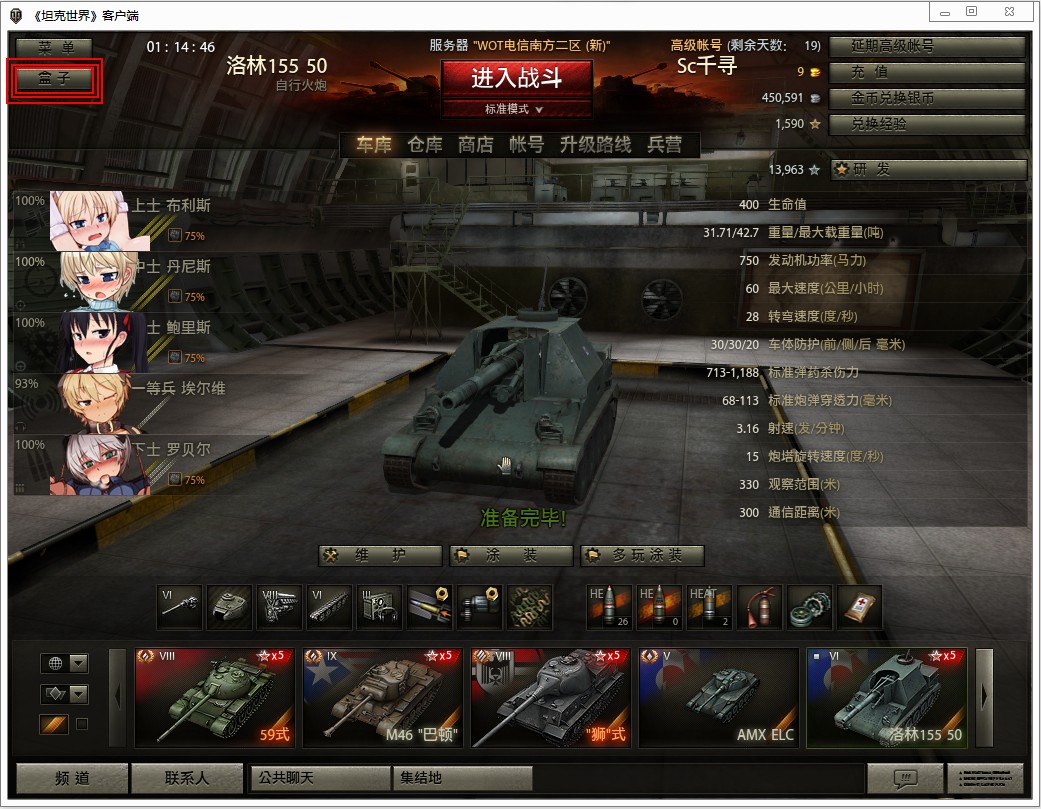 3,右邊:有購買高級(jí)帳號(hào),金幣數(shù)量(人民幣買的)銀幣數(shù)量(游戲幣),經(jīng)驗(yàn)數(shù)量,研發(fā)及當(dāng)前選定坦克參數(shù)。