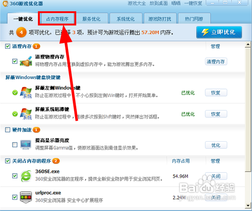 1.一鍵優(yōu)化1、清理內(nèi)存 2、屏蔽Windows鍵盤快捷鍵 3、硬件加速 4、關(guān)閉占內(nèi)存的程序