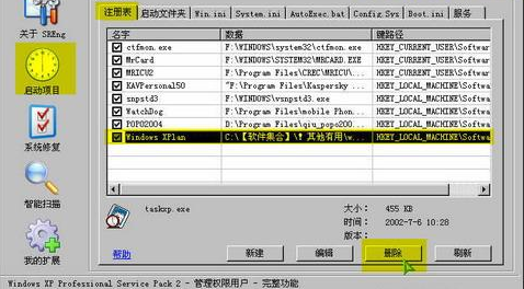 在SREng中"啟動項目""注冊表"鼠標左鍵在對應要修復的項上單擊然后點擊"刪除"