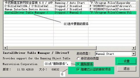 (勾選隱藏已認證的微軟項目),選中有問題的服務后,點“刪除服務”,點“設置”按鈕即可。