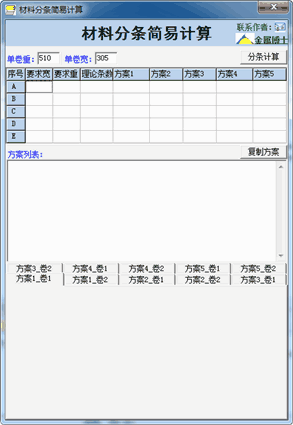 材料分條簡易計算 1.0 免費版 材料分條簡易計算用于簡單計算材料分條,材料分條簡易計算目前只支持5種規(guī)格,2張板的情況。材料分條簡易計算計算結果用圖像形像地描述出來了。材料分條簡易計算源代碼完全公開,如有需要,請來信索取。材料分條簡易計算作者授權你可以修改該程序,但要保留作者的聯系方式(公司標識)。本人是基于眾人拾柴火焰高的原則,僅僅拋磚引玉,希望與志同道合的程序員們一起將材料分條簡易計算軟件不斷完善。