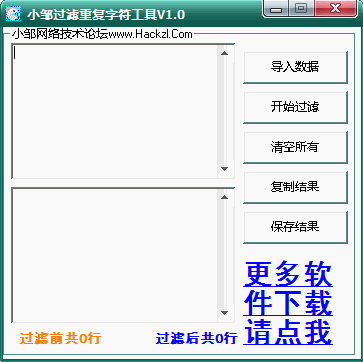 小鄒過濾重復字符工具操作簡單,小鄒過濾重復字符工具主要就是過濾掉重復的內(nèi)容一般用于字典過濾等等知道的都知道雜用撒。我就不多介紹了。小鄒過濾重復字符工具軟件界面簡單。小鄒過濾重復字符工具免費,大家收藏下把。