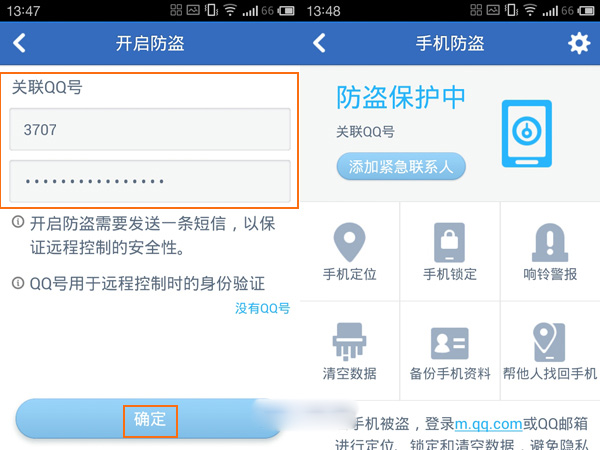 開(kāi)啟手機(jī)防盜功能時(shí),我們尋找綁定QQ賬號(hào)。以后手機(jī)丟失了,我們就可以通過(guò)QQ賬號(hào)進(jìn)行手機(jī)追蹤了。
