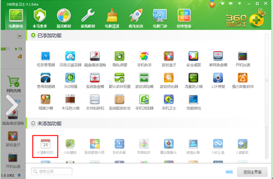 1打開電腦上安裝的360安全衛(wèi)士軟件,然后點擊右側“功能大全”中的“更多”按鈕。2然后在“未添加的功能”項中找到小清新日歷單擊,系統(tǒng)自動添加到功能區(qū)域,然后點擊向右的箭頭。