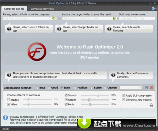 Flash Optimizer 是一個(gè)功能強(qiáng)大簡(jiǎn)單易用的 Flash 動(dòng)畫[*.SWF]文件優(yōu)化工具,程序采用特殊的算法可以將 Flash 動(dòng)畫文件的體積縮小到只有原來(lái)的 60%-70%,而可以基本保持動(dòng)畫品質(zhì)不變(Compress Flash SWF files with no quality loss)。是網(wǎng)管、網(wǎng)頁(yè)設(shè)計(jì)師,專業(yè) Flash 動(dòng)畫設(shè)計(jì)師首選的 Flash 優(yōu)化壓縮解決方案