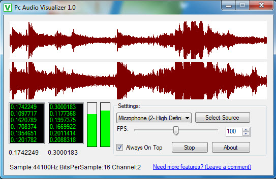 這需要從聲卡的音頻,所以在電腦上播放的任何音頻可以被本工具捕獲。它顯示聲音的波形圖形,不同種類的聲音,歌曲,樂器等波形都不會相同。
