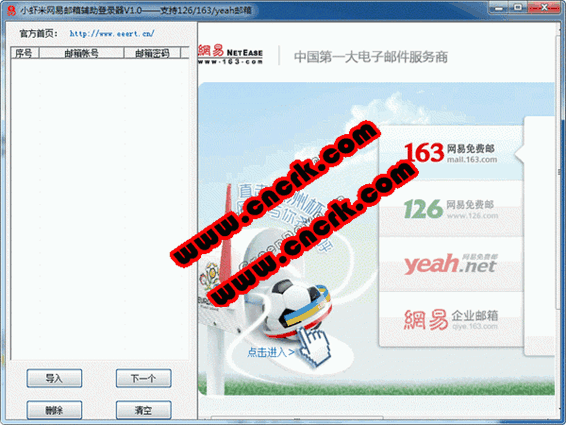 小蝦米網(wǎng)易郵箱輔助登錄器(126郵箱登錄、163郵箱登錄) 適合需要登錄大量郵箱操作的用戶。小蝦米網(wǎng)易郵箱輔助登錄器(126郵箱登錄、163郵箱登錄)一鍵導(dǎo)入,快捷登錄,小蝦米網(wǎng)易郵箱輔助登錄器(126郵箱登錄、163郵箱登錄)避免了在瀏覽器上一個(gè)個(gè)登陸之苦。
