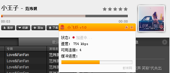 小飛蝦的功能非常簡單,就是加速緩沖,和土豆等網(wǎng)站的飛速土豆等屬于同類軟件,實(shí)測速度聯(lián)通10M網(wǎng)絡(luò)情況下速度在1M-1.5M左右,基本在5-6秒以內(nèi)緩沖完成一首歌。