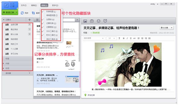 圖文記事:圖文并茂 豐富多彩想寫一篇圖文并茂的記事時,使用天天記事編輯圖文、拍照、插入表情和地理位置等內(nèi)容,隨時記錄豐富多彩的工作和生活。