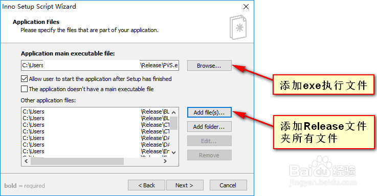 例如C#項目:①點擊Browse按鈕添加exe執(zhí)行文件;②點擊Add File(s)按鈕添加Release文件夾所有文件,如下圖所示: