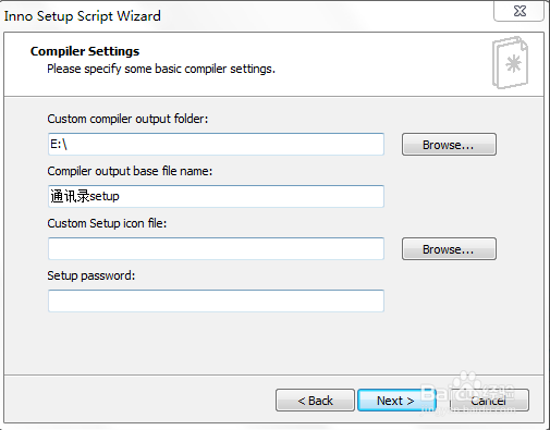 next,選擇生成的setup文件保存路徑,我選擇的是E盤,第二行為生成setup文件的名字,然后點擊next,最后點擊finish