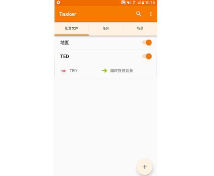 讓「啟動(dòng)地圖」這個(gè)配置,去連結(jié)剛剛建立的「開啟媒體音量」任務(wù)。下圖中則是我另外一個(gè)使用例子,當(dāng)我開啟 TED 影片 app 時(shí),也自動(dòng)觸發(fā)開啟媒體音量功能。