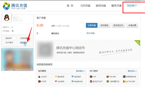 3、再點(diǎn)擊【我的賬戶】選擇【我的服務(wù)】,最后點(diǎn)擊微會(huì)員下方的關(guān)閉按鈕進(jìn)行操作即可;