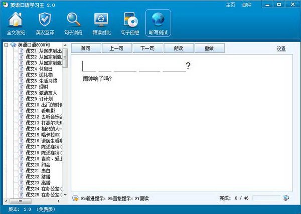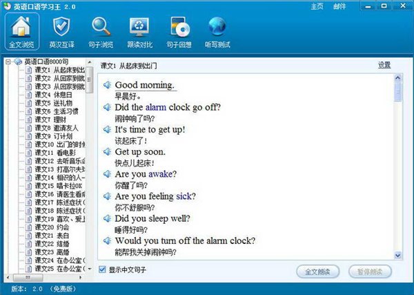 英語(yǔ)口語(yǔ)學(xué)習(xí)王是一款免費(fèi)英語(yǔ)口語(yǔ)學(xué)習(xí)軟件,英語(yǔ)口語(yǔ)學(xué)習(xí)王精選了《英語(yǔ)口語(yǔ)8000句》、《常用口語(yǔ)800句》、《出國(guó)實(shí)用英語(yǔ)會(huì)話》、《英語(yǔ)900句》、《英語(yǔ)會(huì)話300句》等常用英語(yǔ)口語(yǔ)教材,共計(jì)一萬(wàn)二千多句,英語(yǔ)口語(yǔ)學(xué)習(xí)王所有句子均采用真人語(yǔ)音朗讀,并配以中文譯文,通過(guò)全文朗讀、句子即指即讀、錄音對(duì)比、句子聽(tīng)寫(xiě)等實(shí)用的軟件功能,幫助您迅速提高英語(yǔ)口語(yǔ)和聽(tīng)力水平。【軟件特點(diǎn)】