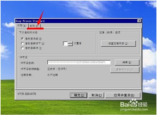 10、打開軟件會提示我們輸入密碼,我們輸入之前設(shè)定的密碼就打開了軟件設(shè)置界面,看圖所示,在“狀態(tài)” 選項卡中,有三種設(shè)置“啟動后凍結(jié)、啟動后解凍下 _次重啟、啟動后解凍”。