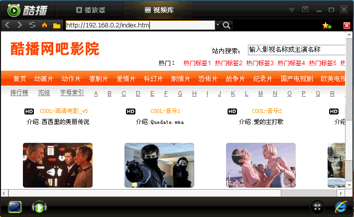 酷播播放器視頻庫(kù)可內(nèi)置自定義視頻內(nèi)容頁(yè)面,可讓架設(shè)者輕松實(shí)現(xiàn)視頻內(nèi)容和內(nèi)網(wǎng)界面一體化融入于用戶(hù)操作的界面. 用戶(hù)只要通過(guò)播放器客戶(hù)端的網(wǎng)絡(luò)媒體庫(kù)就能點(diǎn)播到局域網(wǎng)的視頻資源, 使用戶(hù)使用便捷。