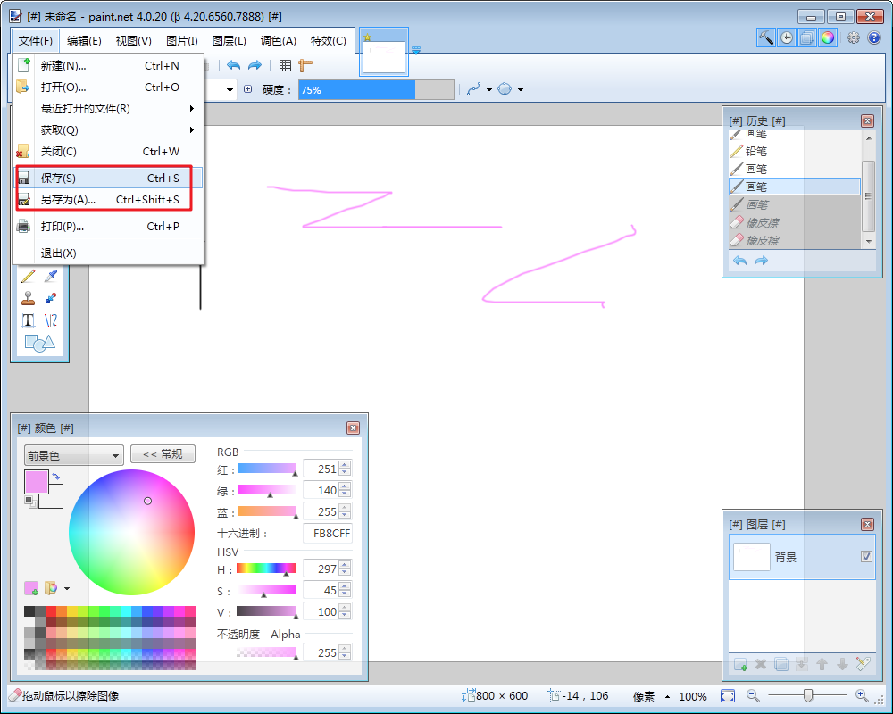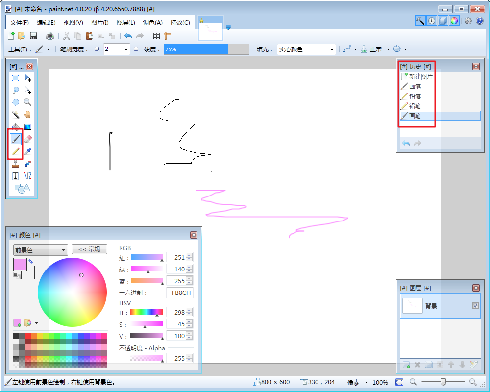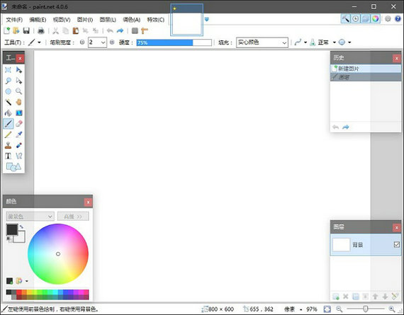 簡單直觀的用戶界面Paint. NET使用Windows Aero 界面,具有立體感、透視感,使用戶擁有了家的感覺。另外由于其簡單直觀的界面,使用戶很容易找到自己需要的工具。兩側(cè)共有四個窗口——工具、歷史記錄、顏色和圖層。用戶可以在窗口頂部的下拉菜單中自行選擇刪除或添加。