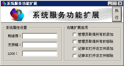系統(tǒng)服務(wù)功能擴(kuò)展是一個(gè)簡(jiǎn)單的小工具,包括系統(tǒng)屬性相關(guān)設(shè)置和管理員取得所有權(quán)快捷設(shè)置;包括:windows vista以上版本系統(tǒng)屬性相關(guān)、右鍵擴(kuò)展管理員取得所有權(quán)添加/移除、記事本打開該文件添加、移除功能,方便快捷;