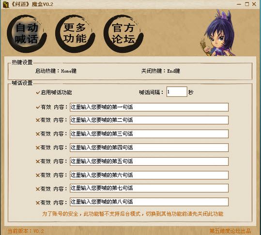 問道魔盒是一款可以在問道游戲中自動(dòng)喊話,自動(dòng)擠一線的輔助工具,更多功能正在開發(fā)中,本軟件所有功能均為模仿鍵盤鼠標(biāo)操作,絕非外掛。