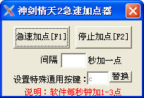這是一款可以為神劍情天快速游戲加點(diǎn)的輔助工具。具有急速加點(diǎn)功能,設(shè)定好間隔時(shí)間,進(jìn)入游戲后按下F1鍵即可開始飛速加點(diǎn),方便玩家操作。