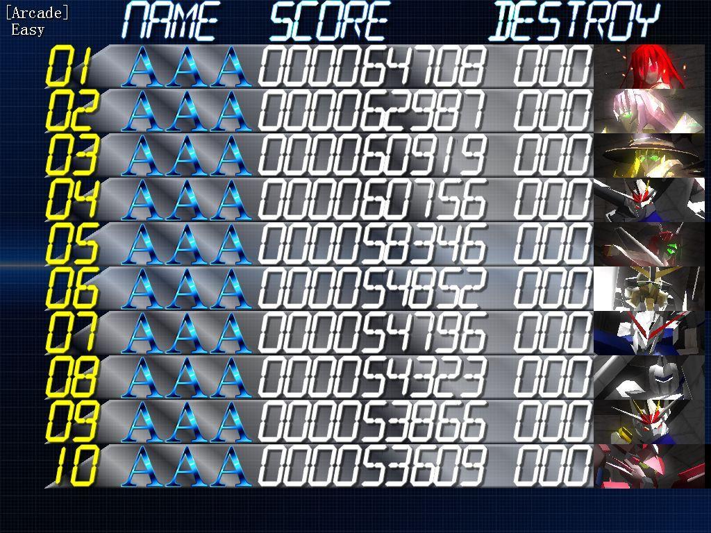 積分排名:顯示單機模式中,街機模式3個難度和生存模式的最終得分。