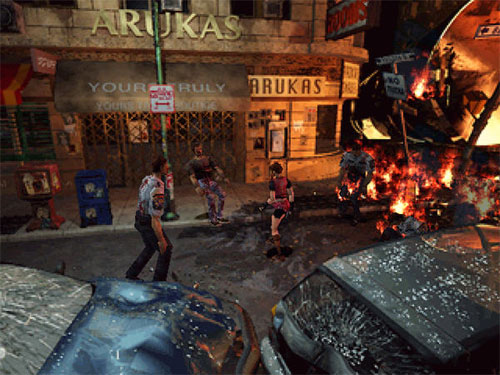 到了拉昆市,令我震撼的是整個街道上到處都是渾身是血、兩眼無神的人,或許說是“僵尸”會來得比較適當。就在我躲避街道上無數(shù)僵尸的同時,我遇到同樣在躲避僵尸的克蕾兒。好不容易上了車,她在車上對我說,她來拉昆市尋找他兄長-克里斯的下落。本以為暫時安全了,接下來只要到警署問個清楚,拉昆市為何會變成這副模樣?不過,好死不死,在汽車后座竟有只僵尸,更糟的是后頭來了一輛超速的大卡車,在我還沒來得及開他罰單前他就撞了上來!我跟克雷兒在情急之下跳車,也因此而分散了。我們只得相約在警署會合。