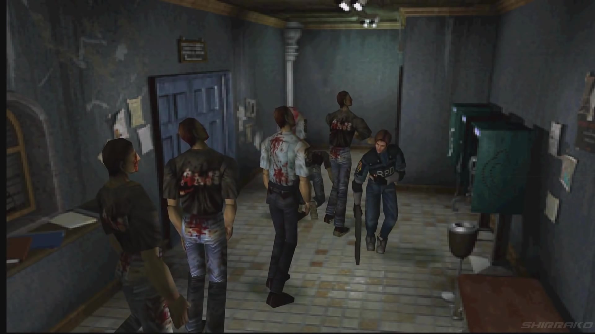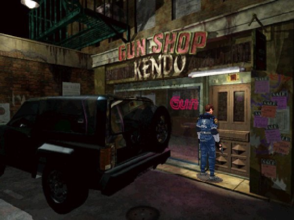 事到如今,只好硬著頭皮去面對街道上那些討人厭的僵尸。我拔出了槍,將街道上的僵尸解決后,進到了后巷內(nèi)的一間軍火用品店,一進門便讓我吃了一驚,只見軍火店的老板拿著散彈槍對我喊著 “別動!”。還好,既然還會講話那就不是僵尸。我問他這里究竟發(fā)生了什么事,不過他也不太了解。當我在店里休息時(到處走走,調(diào)查一下),突然,街上的僵尸破門而入!店長躲避不及而慘遭毒手,那畫面真是慘不忍睹。替店長報了仇之后,拾起他身上的散彈槍(調(diào)查兩次),心中暗自發(fā)誓,定要找出拉昆市發(fā)生異變的真相。從軍火用品店的后門出去,經(jīng)防火巷、籃球場、停車場等地,一路上都是愚蠢又討厭的僵尸。為了節(jié)省彈藥,我盡量閃躲僵尸前進,不再一一射殺。穿過了停車場的巴士,以及停車場的另一半?yún)^(qū)域,不一會兒就來到警察局的前庭。不知道克蕾兒此刻怎么樣了?