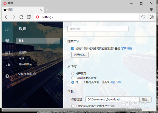 打開歐朋瀏覽器首頁鼠標放在歐朋瀏覽器左上角“Opera”然后下拉鼠標點擊“設置”進入后臺界面。