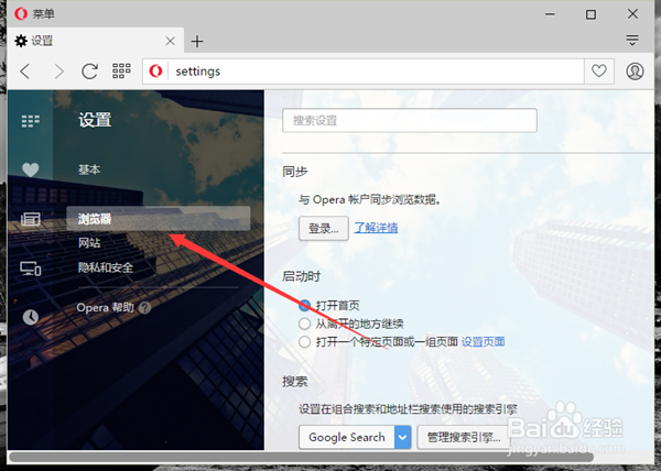 5、在“設置”對話框中,選擇左側窗格的“瀏覽器”選項卡。如圖所示;