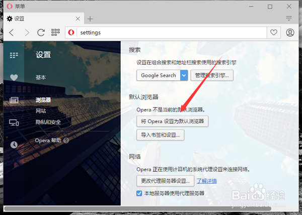 6、在“基本設置瀏覽器”選項卡的右側窗格,找到“默認瀏覽器”中的“將Opera設置為默認瀏覽器”選項按鈕并點擊它即可。如圖所示;