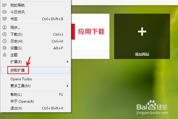 打開Opera歐朋瀏覽器,點擊左上角的Opera,選擇獲取擴展