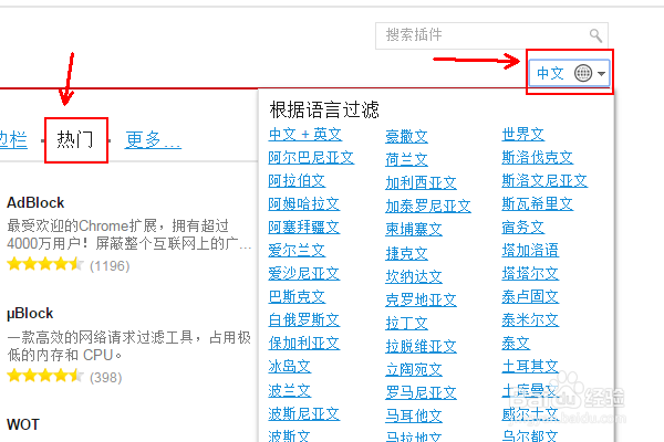 點擊“熱門”,在右側箭頭指向的位置將語言選擇為中文,默認的是中文加英文