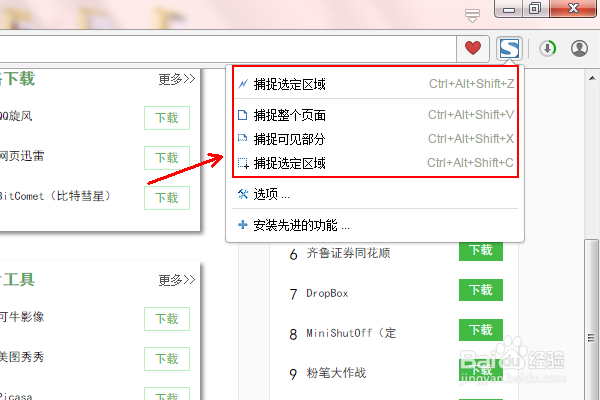 那么如何使用呢?我們隨便打開一個網(wǎng)頁,點擊右上角的白色的大寫S標志,在彈出的列表里面選擇“捕捉選定區(qū)域”