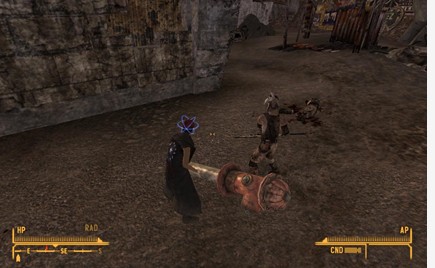 戰(zhàn)斗系統(tǒng)游戲保持了前作的V.A.T系統(tǒng),在游戲中可以隨時進入V.A.T系統(tǒng),時間暫停,你可以選擇攻擊敵人的部位,確定之后時間恢復流動,角色就可以按指令行動了。指令執(zhí)行結束后恢復常態(tài),這個系統(tǒng)也可以說是創(chuàng)造了一個回合,回合的時間是固定或者可以說是公平的,差異體現(xiàn)在玩家控制的角色和被攻擊敵人的數(shù)值上,在這種情況下單位之間不同的數(shù)值是有決定性意義的。而游戲對于操作的要求就放在了何時開始這個回合上,如果在我們所創(chuàng)造的回合中敵人是無法攻擊我們的(比如使用遠程武器攻擊只能使用近戰(zhàn)攻擊的僵尸、躲開敵人的攻擊后或者在敵人上彈的時候),在這種情況下我們的優(yōu)勢就很大了,也就是說,游戲中的V.A.T系統(tǒng)在一定程度上解決了動作射擊和角色扮演混搭問題。