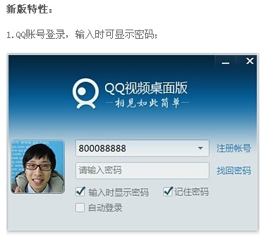 騰訊發(fā)布了QQ視頻桌面版1.0 beta,該軟件可以用QQ賬號登錄,輸入時可顯示密碼,實時輕松校對,采用大字號,方便辨認(rèn),界面簡潔,操作簡單,主面板顯示本地視頻預(yù)覽畫面,點擊QQ好友即可發(fā)起視頻會話。