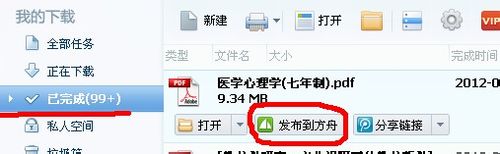 下載完成后,如下圖所示,在“已完成”欄下找到我們從115網(wǎng)盤下載的文件,然后單擊該文件,在展開的選項里單擊“發(fā)布到方舟”