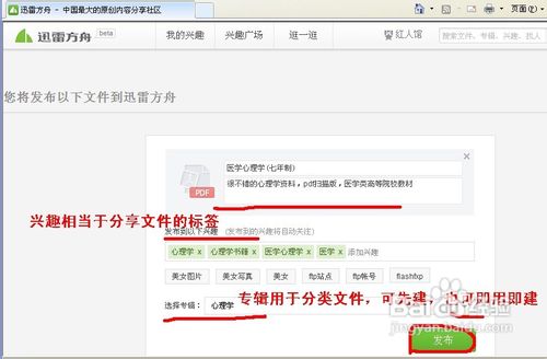 隨后彈出系統(tǒng)默認(rèn)的瀏覽器,進(jìn)入迅雷方舟文件發(fā)布頁面,如下圖所示,我們填寫好各項內(nèi)容后,單擊“發(fā)布”按鈕,即可完成發(fā)布。